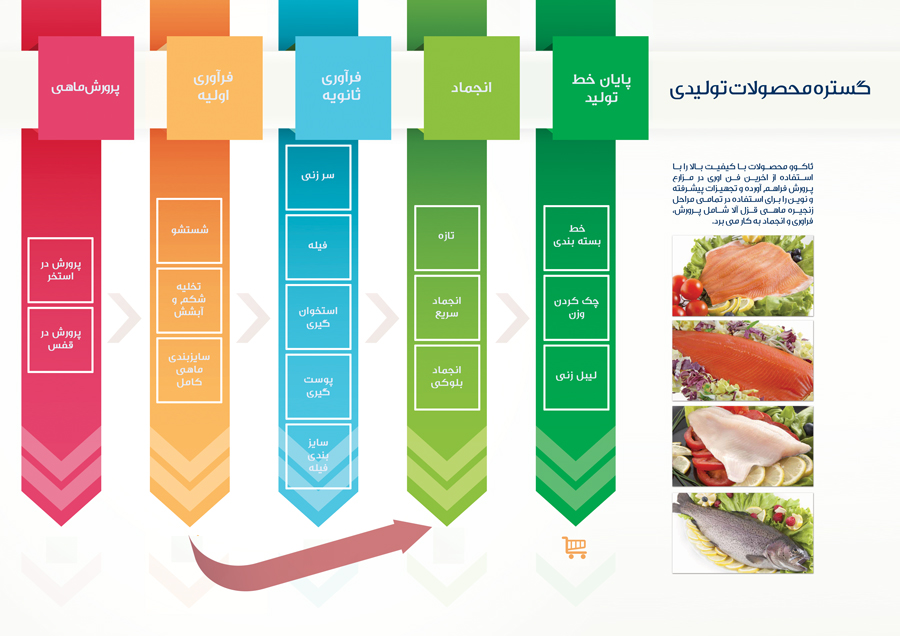 ئاکوو فیش محصولاتی با کیفیت بالا و با استفاده از آخرین تکنولوژی تولید در مزارع را تامین می نماید و با استفاده از تجهیزات پیشرفته در تمامی مراحل فراوری که تماما توسط گروه ئاکوو طراحی و ساخته شده است ماهی قزل آلا و قزل الای سالمونی را بنا بر تقاضای مشتری در بهترین شرایط فراوری می نماید. |